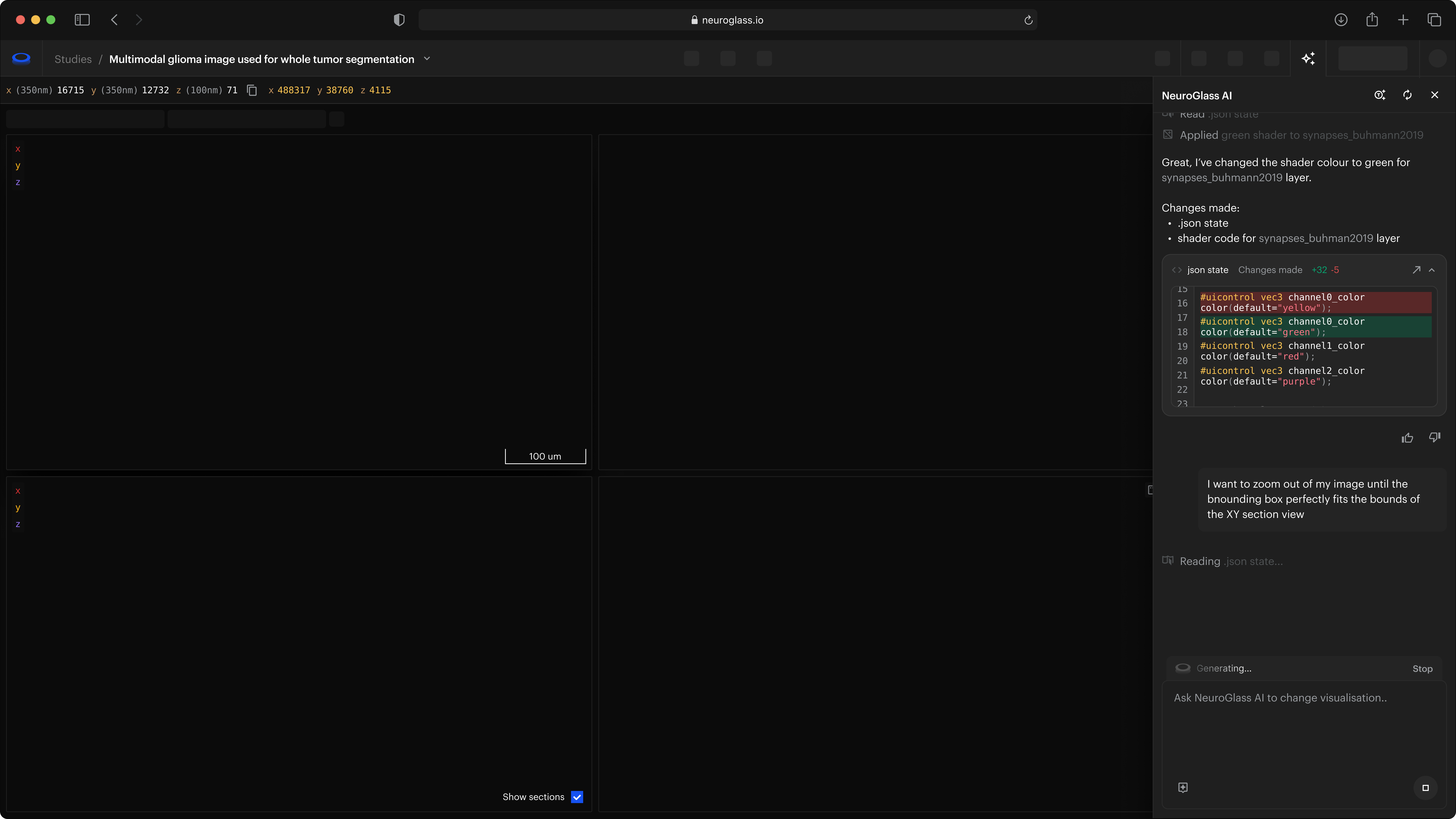 NeuroGlass is a cloud application that allows smooth visualisation of large microscopy data (e.g. Electron Microscopy, Light Sheet, etc). It also integrates an advanced UI that allows to organise and manage your data, to share it with your colleagues and to generate figures for your publication. All of this without the need to install anything on your computer.